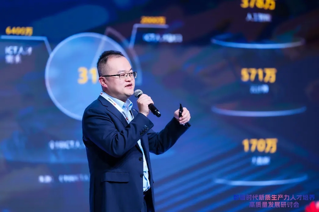 深圳职业技术大学华为ICT学院支持中心主任王隆杰在“深职大-华为产教融合共育ICT人才”主题演讲中,回顾了学院与华为的合作历程,并对双方的合作成果进行了介绍。340名在校生通过华为HCIE认证。这些数据不仅体现了人才培养的成效,也验证了“课证共生共长”理论。围绕培养高端应用型人才的办学理念,呼吁各方凝练经验、复制成功案例,共同推动ICT教育的全球化发展。