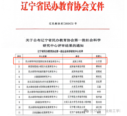 10月21日,辽宁省民办教育协会《关于公布辽宁省民办教育协会第一批社会科学研究中心评审结果的通知》,我校成功获批2024年辽宁省民办教育协会第一批社会科学研究中心中的“民办高等学校质量保证体系建设研究中心”。