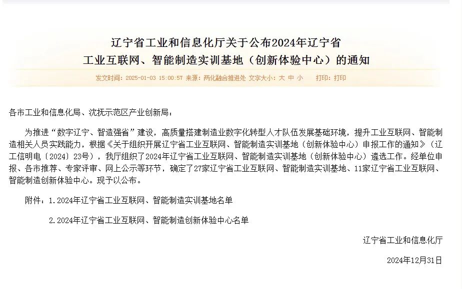 此次遴选依据《关于组织开展辽宁省工业互联网、智能制造实训基地(创新体验中心)申报工作的通知》(辽工信明电〔2024〕23号)文件要求有序开展,旨在推进“数字辽宁、智造强省”建设,为制造业数字化转型人才队伍发展搭建高质量基础环境,提升工业互联网、智能制造相关人员的实践能力。经过单位申报、各市推荐、专家评审、网上公示等严格环节,全省共有27家单位,被确定为省级工业互联网、智能制造实训基地。