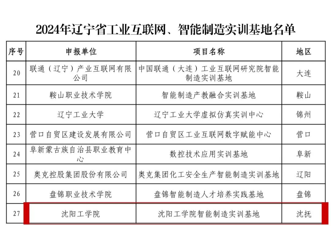 近日,辽宁省工信厅2024年辽宁省工业互联网、智能制造实训基地(创新体验中心)遴选结果揭晓,我校凭借突出优势,成功获批2024年辽宁省工业和信息化厅智能制造实训基地。