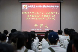 7月26日9:00,2023年“学习党的二十大 永远跟党走 奋进新征程”主题教育活动井冈山专题培训班(第三期)开班仪式在基地综合楼306教室举行。全国青少年井冈山革命传统教育基地党群工作处处长钟国华发表致辞,并为研学班授予班旗。