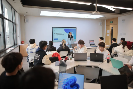 活动现场,琚雨薇老师围绕DeepSeek、Kimi、WPS灵犀、夸克AI等几款主流AI工具的功能及组合,在制作PPT应用方面展开细致讲解及操作演示,从基础功能到高级应用,逐步深入,并比较各种工具特性差异。在场同学们热情高涨,积极动手实践,遇到问题相互交流、共同探讨。